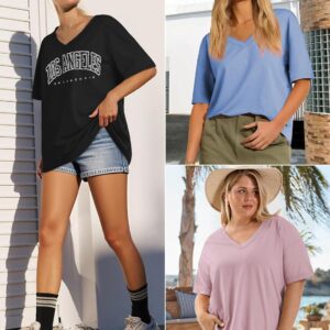 I got lucky and was able to purchase this brand on an $11.99 sale [reg $19.99].My reason for purchasing was bc I recently relocated from California to NW Washington and needed some tee’s that weren’t men’s, plus they needed to wear soft against my skin. I have extremely painful fibro, so the slightest irregularity of a garment, awa its weight, makes it really hard to find something that’s long wearing, comfortable, and affordable.I purchased the black LA tee in V-neck, and the grey & purpley-pink both in crew-neck.NOTE1. If you’re sized similar to the model, then I guess these tee’s would hang like that. I’m 5’10’, 185, w a real, full bust, and they don’t have that hang look on me, and I bought XL in all 3.2. Tee’s are a poly/cotton/spandex blend. There is a good stretch to them; however, the material weight is different for each of them.3. I would’ve rtd all of them if I were still living in California. I have to have a lightweight, breathable, moisture-wicking tops in high temps. Nothing that would further irritate my condition, but everyone is different!.. LA tee: BEST fit overall. Torso length was shorter, but still covered my Jean zipper, and I have a long torso. Sleeves are longer as well, stopping just above my elbows. Love the V-neck. Compliments this particular style well. It’s well-made, looks to be fade resistant, and appears that I would be able to wear for some time before looking worn, if at all. It’s a true black and dense enough to wear any color undergarnent you’d like. Even tho this is the heaviest tee I own, I still rated it a 5-star, bc w the V-neck and shorter length it wasn’t sitting heavy on my shoulders. Packaging wrinkles fell out thru trying on process… Grey tee: Material is light like a pajama tee. Itched my back and neck like crazy. Looked like I was wearing a man’s workout tee. Hangs long and square from underarm to mid-thigh. Hello, wrinkles; everywhere! Going to launder before making final decision. Disappointing nevertheless… Purpley-Pink tee: Same material weight as LA tee. The overall style matched the grey tee, except it did not make me itch and the wrinkles fell out. The one negative, is that the material pulled tight across my bust, which looks ridiculous when the neckline is loose and the rest of the cut is oversized. I do like the color, but going to exchange for the V-neck style.TO SUM IT UPI like the look of the V overall. I also think w a V, I won’t have the pull at my bust as I did w the crew. If laundering the grey tee doesn’t remove the itch factor, I’m returning it. If it does, then for $11.99, I’ll keep it, but wear it as a sleep tee. Had I come across these at regular price, I wouldn’t have purchased any them. Their being on sale allowed me the opportunity to try a different brand and style of tee that I would not have done otherwise. 😊I apologize for the length of my review. I hope you found some of my info helpful. 🪷