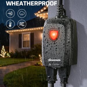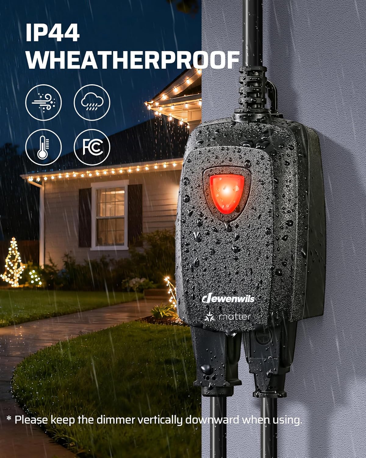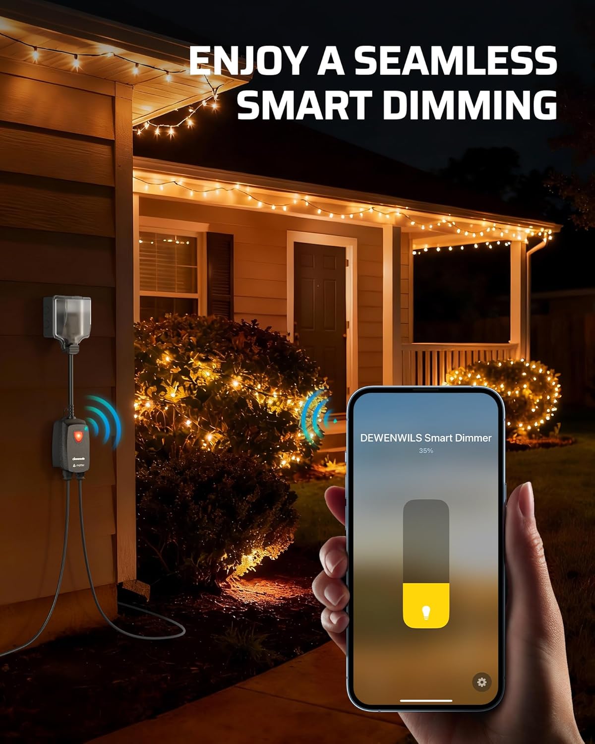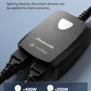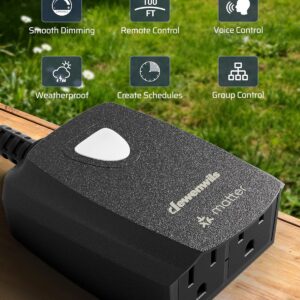 [Matter-Certified Compatibility] Our dimmer for outdoor string lights works seamlessly with major Apps including Apple Home, Alexa, Google Home, and SmartThings, allowing you and your family to control on/off, brightness, and schedules from anywhere[Adjustable Dimming Range] This smart dimmer delivers smooth, full-spectrum control from ultra-low to bright, letting you set the perfect light for any moment—whether you want a cozy mood or focused brightness for reading and tasks[APP & Remote Control] Adjust brightness via the Matter-enabled app or use the included remote with up to 100 ft control range; enjoy flexible lighting control from two different locations for added convenience[Wide Compatibility] Dual outlets let you control two lights at once, supporting up to 400W incandescent and 200W dimmable LED; ideal for string lights, landscape lighting, patio setups, and holiday decor; Note: Please ensure your lights are dimmable before use[Reliable & Durable] Sturdy PC housing and SJTW 14/3C wire provide heat dissipation, fire resistance, and weather protection; built to withstand sun, moisture, and wear for long-term outdoor use; Safety and quality