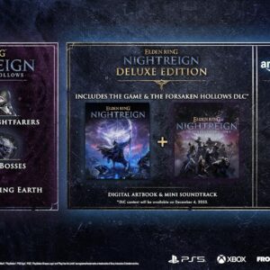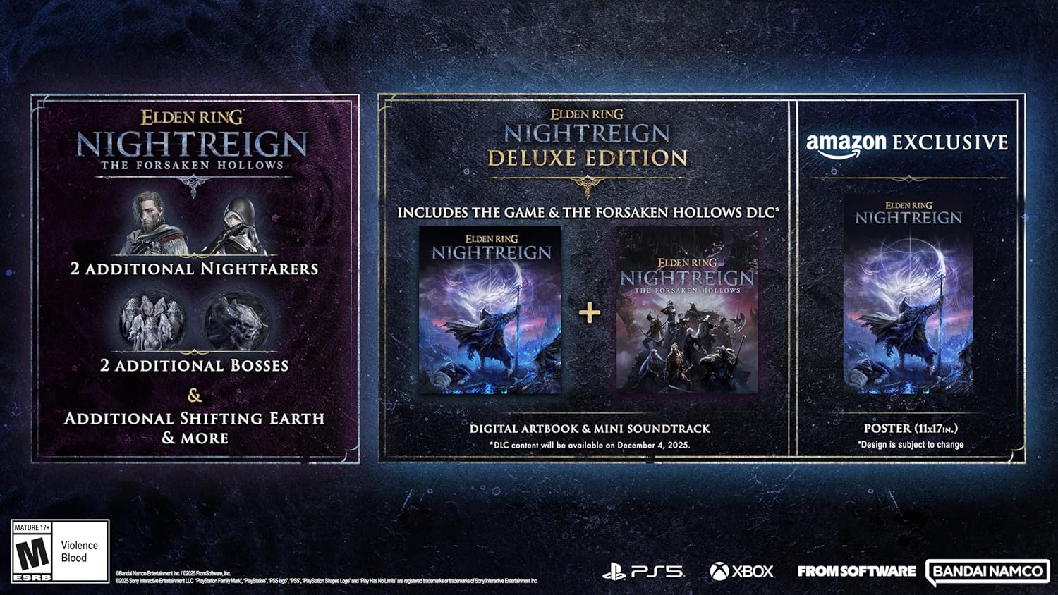 Amazon Deluxe Edition includes: Elden Ring Nightreign Base Game, Additional playable characters and bosses, Digital Artbook + Mini Soundtrack, 11 x 17 Key Art Poster in box