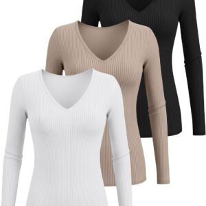 Ficerd 3 Pack Women’s Long Sleeve T Shirts Cotton V Neck Slim Fit Tops Ribbed Knit Layering Casual Basic Tees Fall