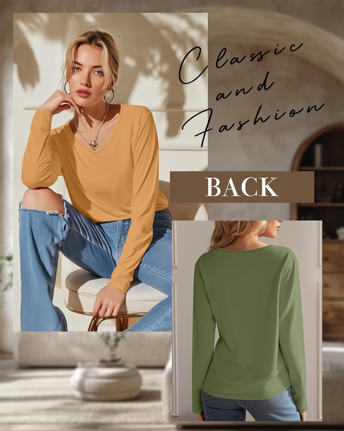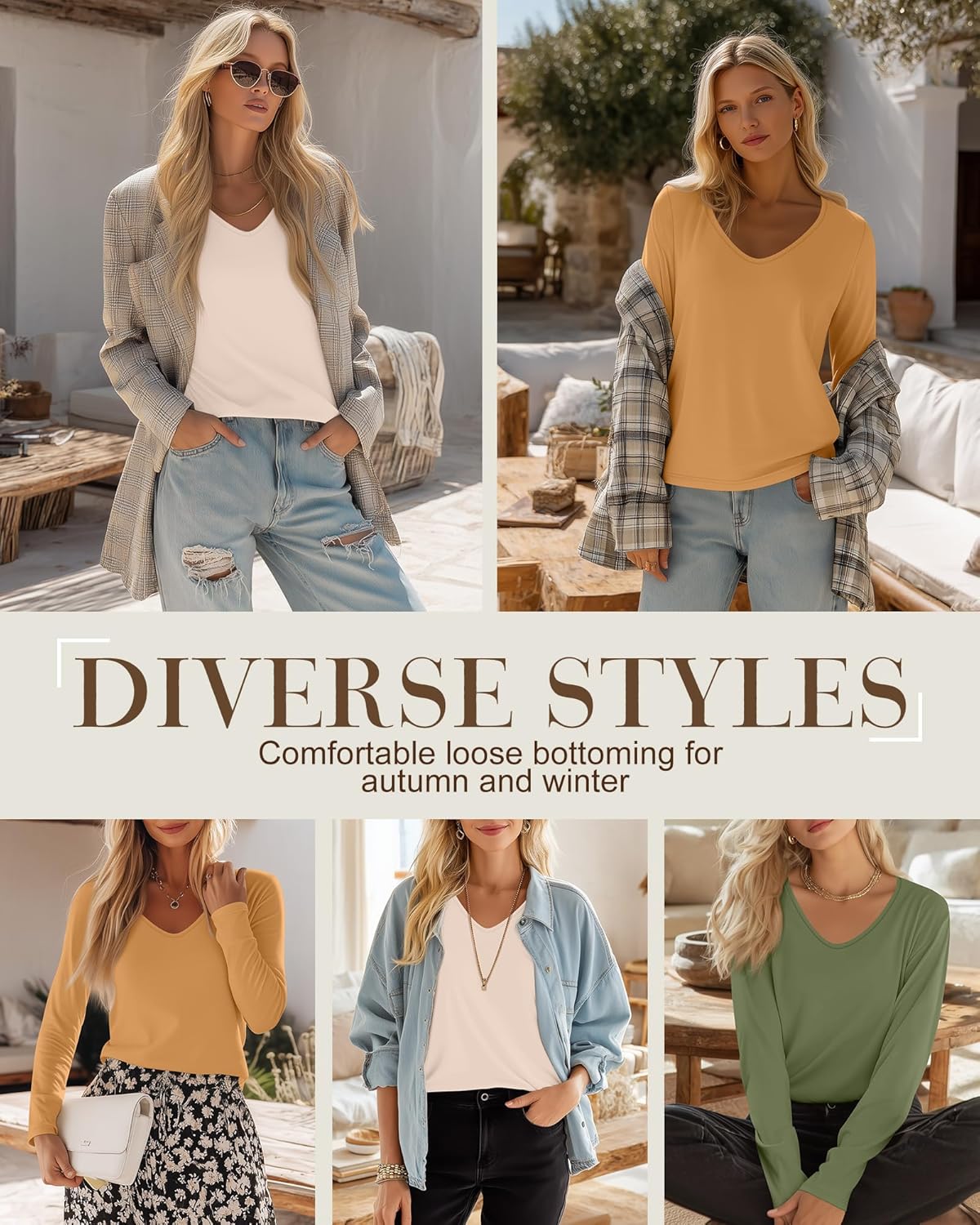 V-neck long-sleeved top, combining comfort and style, available in a variety of colors, fashionable and versatile.