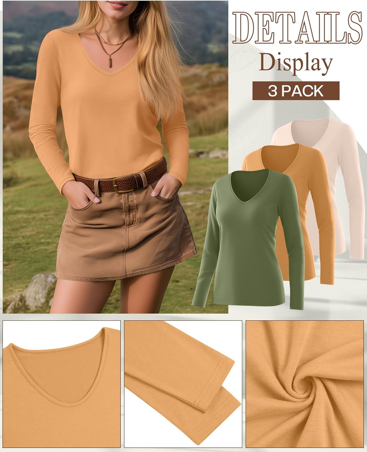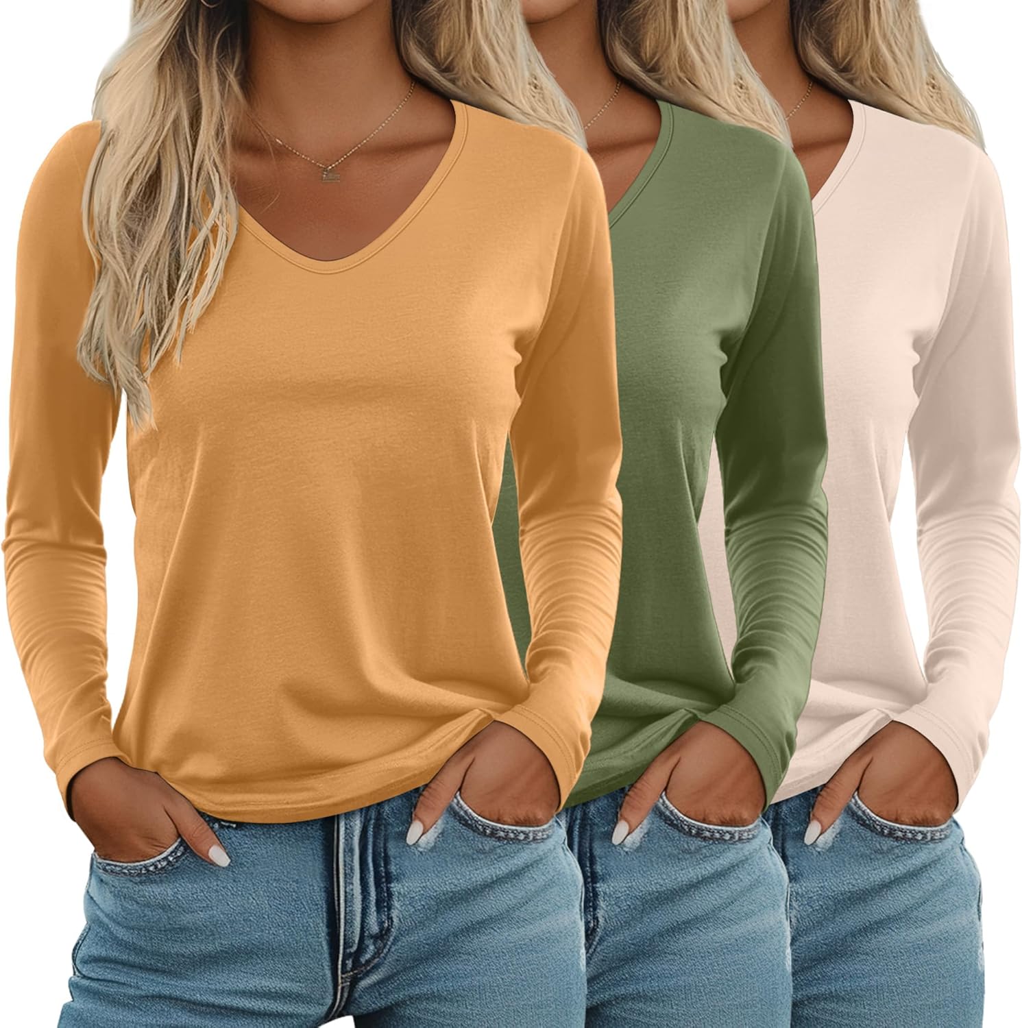 This 3-pack of long-sleeve V-neck shirts is such a great find. The fabric is incredibly soft and comfortable against the skin, and the loose fit is flattering without feeling oversized, true to size. They’re the kind of shirts you can throw on for anything, running errands, working from home, layering under jackets and cardigans, or just relaxing.The length is perfect, the sleeves fit nicely, and the V-neck is modest but still stylish. I love that the colors were exactly as advertised and still look great after washing (no shrinking or fading). These have already become some of my go-to shirts for fall, and I’ve bought several sets in different colors.For the price, the quality is honestly fantastic. I’d definitely recommend this set if you want comfortable, versatile basics for cooler weather.