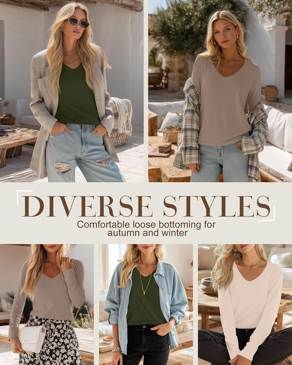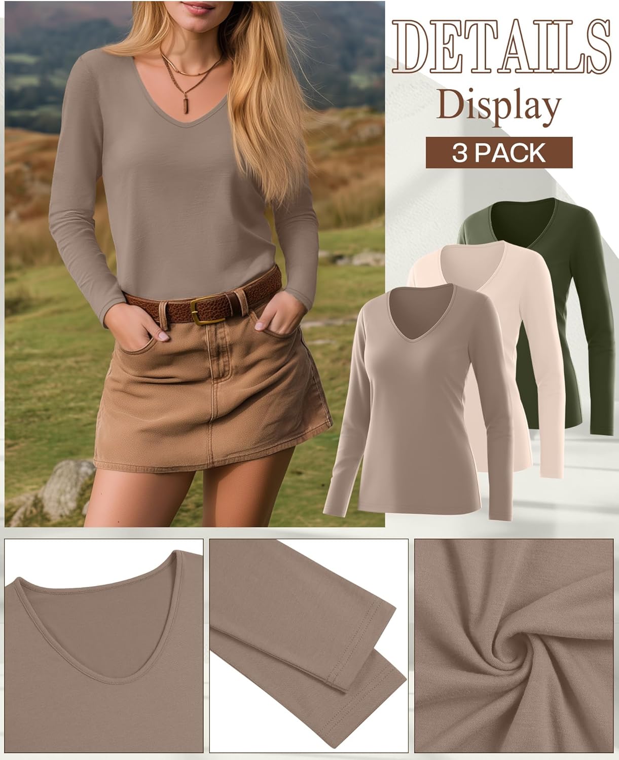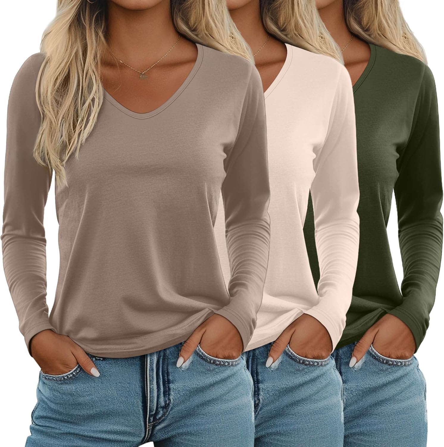 This 3-pack of long-sleeve V-neck shirts is such a great find. The fabric is incredibly soft and comfortable against the skin, and the loose fit is flattering without feeling oversized, true to size. They’re the kind of shirts you can throw on for anything, running errands, working from home, layering under jackets and cardigans, or just relaxing.The length is perfect, the sleeves fit nicely, and the V-neck is modest but still stylish. I love that the colors were exactly as advertised and still look great after washing (no shrinking or fading). These have already become some of my go-to shirts for fall, and I’ve bought several sets in different colors.For the price, the quality is honestly fantastic. I’d definitely recommend this set if you want comfortable, versatile basics for cooler weather.