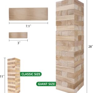 【UPGRADE LIGHTER WOOD FOR LARGE SIZE】We upgraded the wooden blocks to be lighter than similar products that use pine wood on the market for smooth playability. The lightweight wood with smooth edges made removing the wooden block at the bottom easy. It could start at 2.5 FT and grow over 5 FT tall tower when played (requires your skills). In addition, the blocks are pretty light, so nobody will get hurt when it topples over. Some kids have a set of these that are much heavier, and they have gotten hurt when the wooden tower is tall and falls on them. Safety first for a large stacking game!