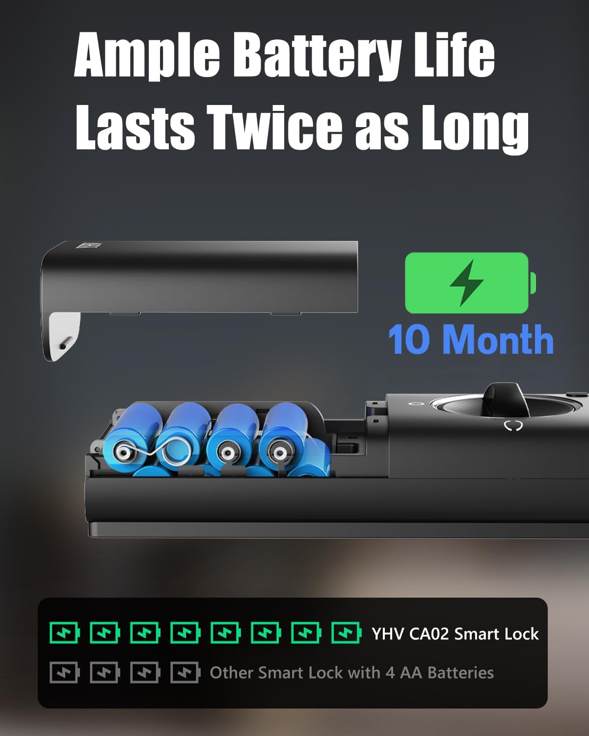 10 Months Battery Life: With 8 AA batteries(not included), the deadbolt lock runs around 10 months. Enjoy the ultimate convenience and peace of mind with our long-lasting power solution(May vary based on how often the lock is used).