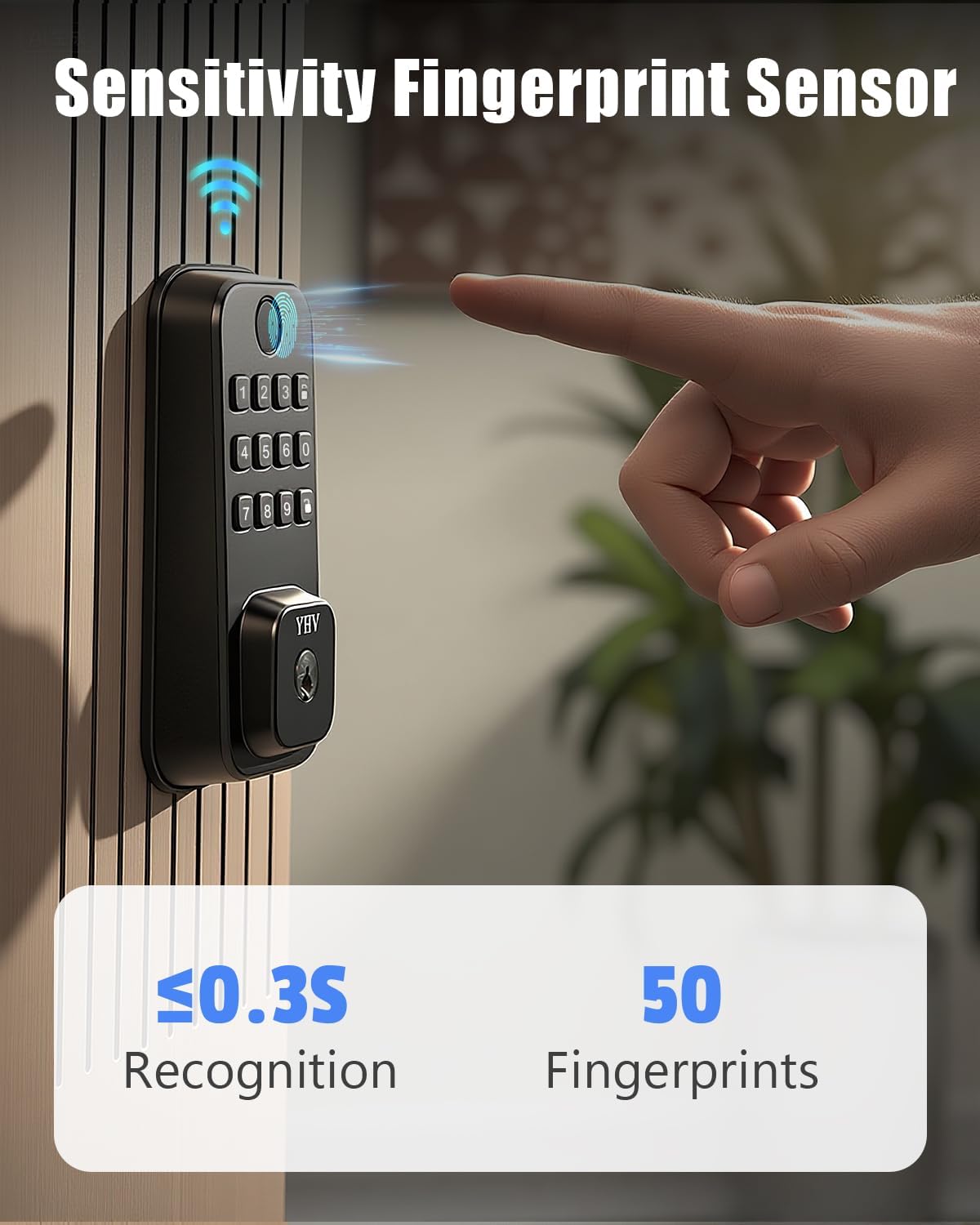 Multi-access Unlock: The YHV smart lock CA02 offers 6 unlocking options like biometric fingerprint recognition, App, password, key or voice control with Alexa/Google Voice Assistant, no need to bridge any gateway.