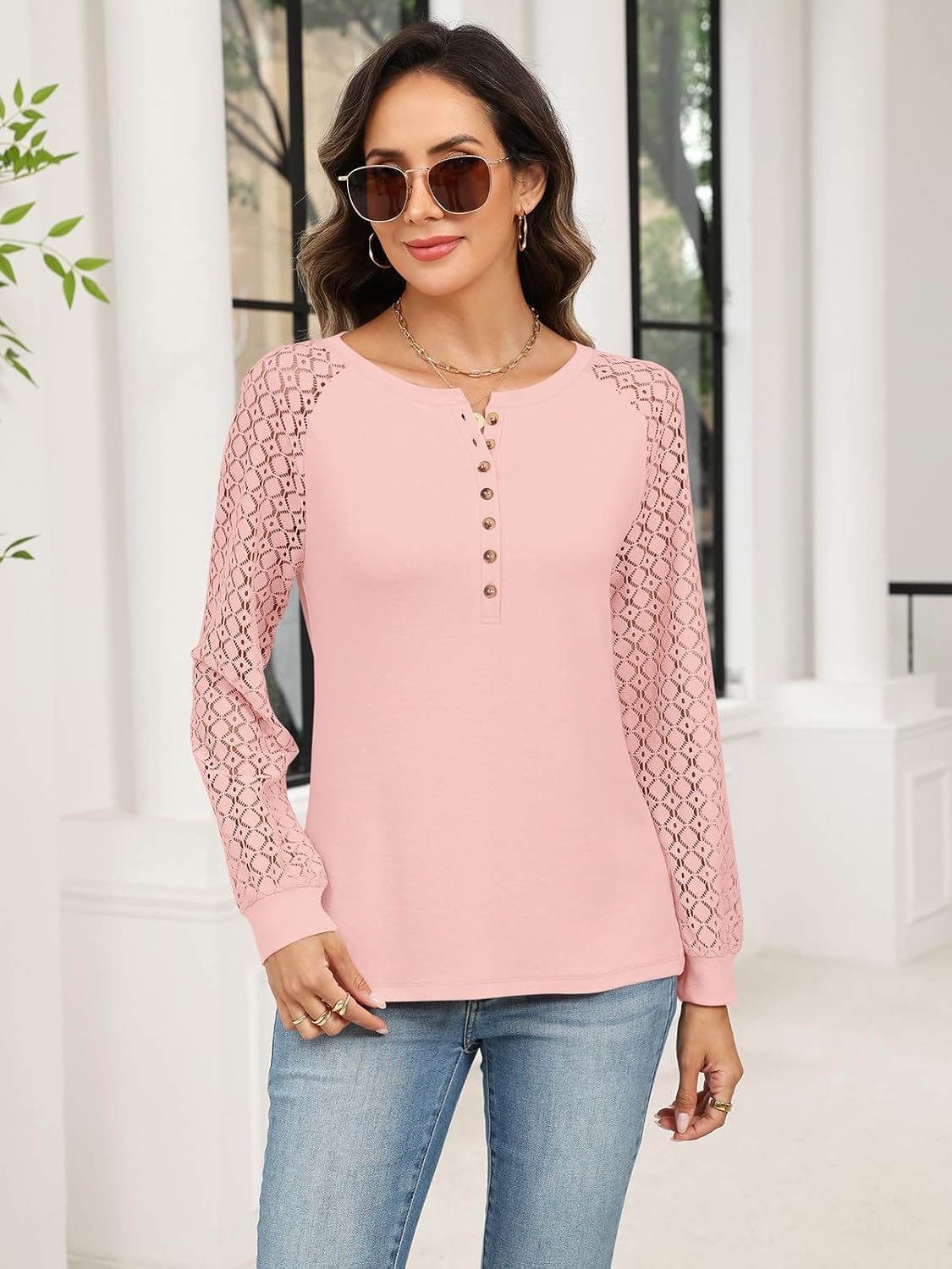 >Casual Crew Neck: Classic Crew Neck T shirt with henley design, allows you come with a various look from comfy to chic and stylish.>Lace Sleeve: Lace sleeve tops is easy to modify your arm. It’s long enough that you can tuck the front in jeans for a casual look.