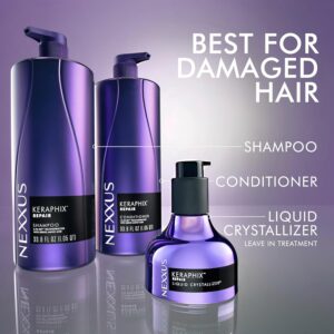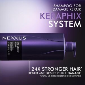 Hair is made up of protein. Every touch, every treatment, every style you love—it all rewrites your hair’s protein. When protein is damaged, hair’s look and feel is compromised. That’s why Nexxus uses protein science not just to repair hair but to restore its ability to perform. It isn’t about one perfect hair day. It’s about a lifetime of healthy hair, built strand by strand. Frequent heat styling and chemical processing can break down disulfide bonds and strip essential amino acids, leading to cuticle erosion and damage deep within the hair fiber. This makes strands weak, dull, tangled, harder to style, and less smooth and shiny. KERAPHIX, our extreme damage repair collection, is powered by KRT Keratin Resistance Therapy with liquid crystal serine amino acid to rebuild internal strength from inside out. Repair and resist visible damage from coloring, bleaching, highlighting, styling, heat and more with 24X stronger hair* restored to be as strong as virgin hair**. This shampoo for damaged hair provides deep moisture to revive dry, brittle strands and KRT technology seals the outer layer to restore elasticity—so hair is shiny, feels soft, resilient, and ready to bounce back with every style. Nexxus, the protein science behind powerful hair since 1979. *System vs. Non-conditioning shampoo **Based on a breakage study on bleached treated hair with Keraphix Shampoo & Conditioner + Treatment vs. Virgin hair.