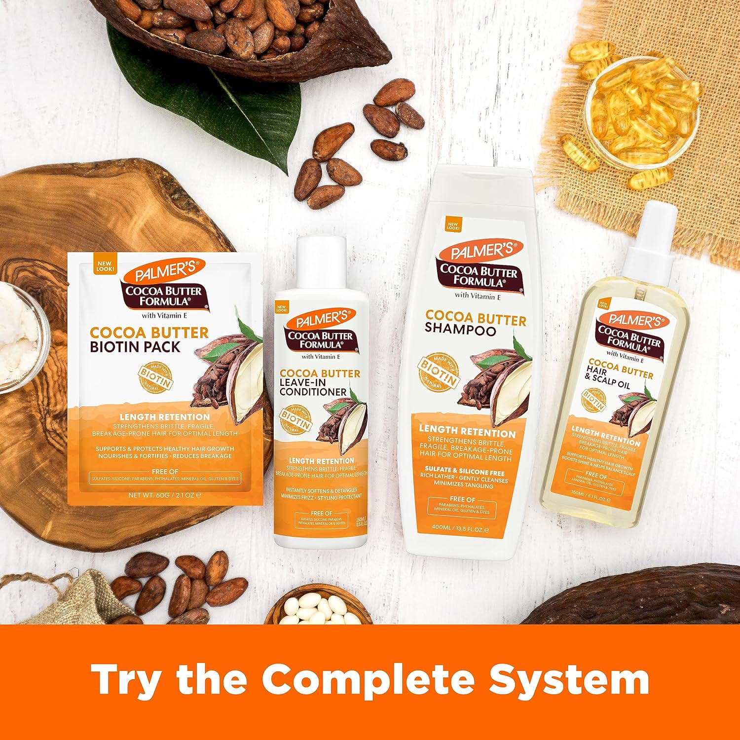 Palmer’s Cocoa Butter Formula Length Retention system with Biotin, fully strengthens hair with powerhouse natural protectants that help block fragileness, brittleness, breakage and split ends, to help hair achieve its optimal length. This silicone free, intense strengthening treatment, nourishes brittleness, breakage and split ends.