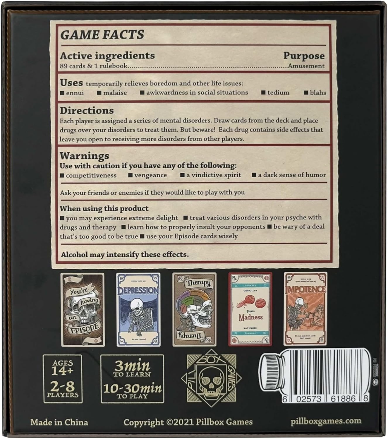 13 reviews for Pillbox Games Side Effects | Strategic Take That Card Game of Therapy, Medication, Disorder Cards & Chaotic Interaction | Stylish Art Game for 2–8 Players Ages 14+ | 10–30 Minute Playtime