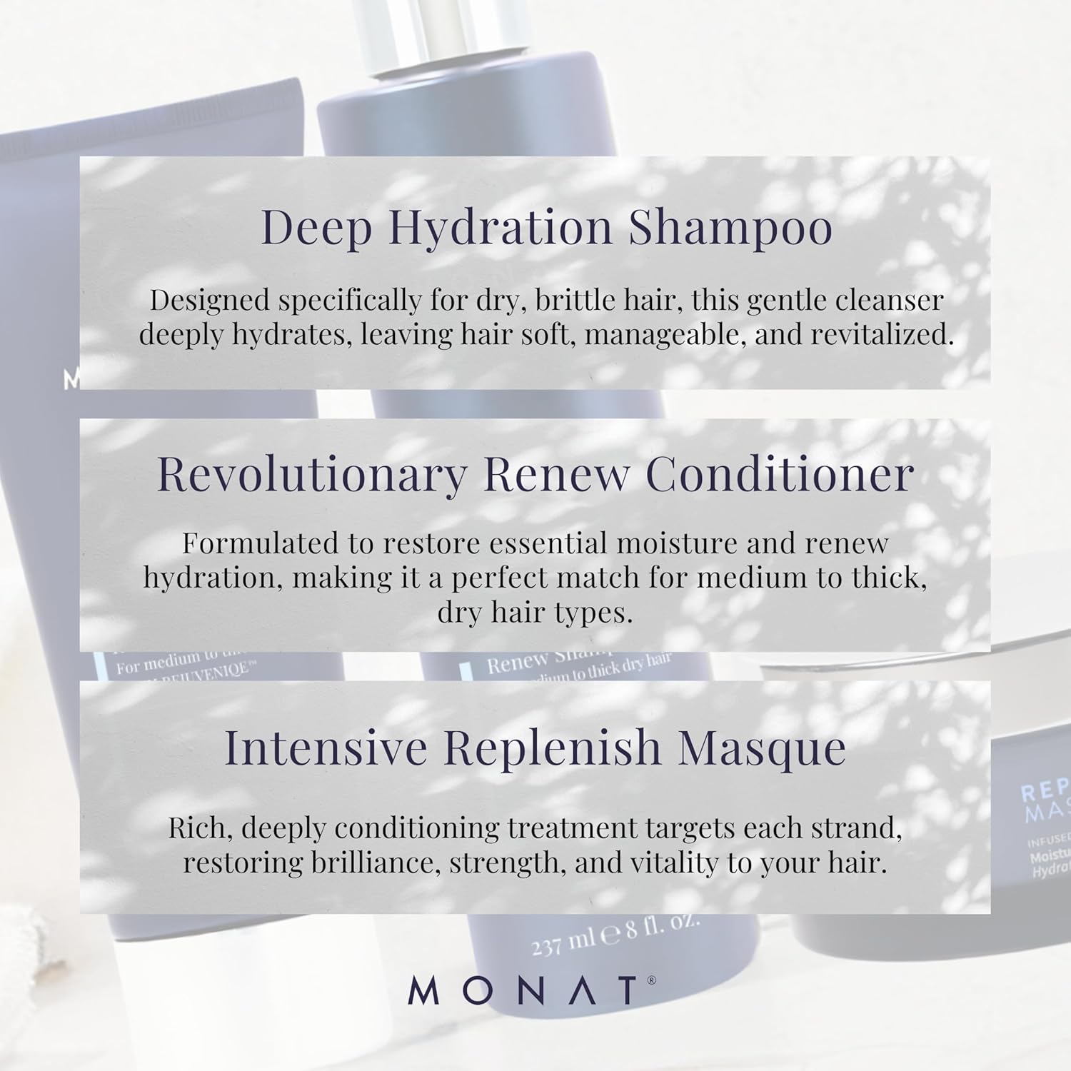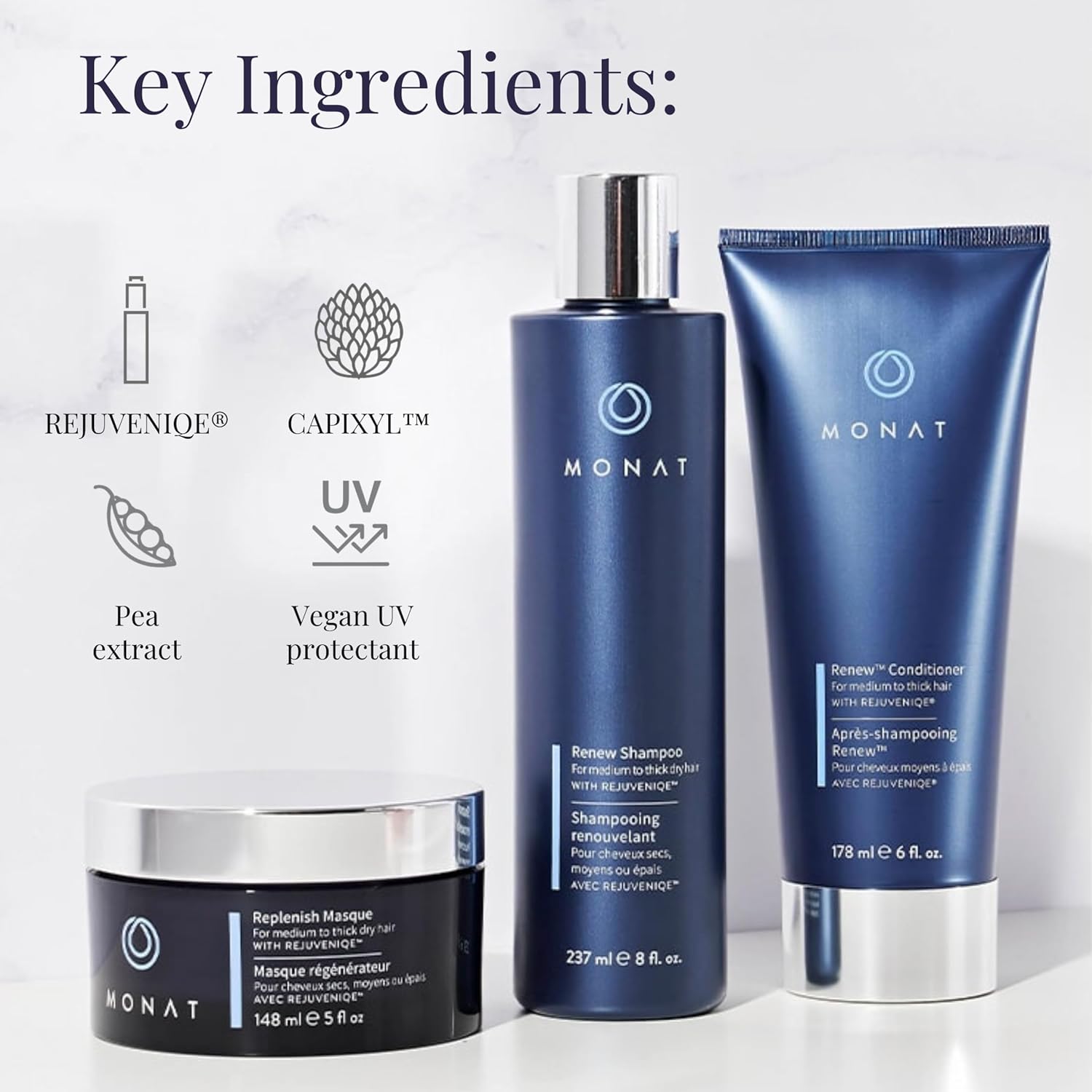 Customer Reviews: 3.6 3.6 out of 5 stars (6) var dpAcrHasRegisteredArcLinkClickAction; P.when(‘A’, ‘ready’).execute(function(A) { if (dpAcrHasRegisteredArcLinkClickAction !== true) { dpAcrHasRegisteredArcLinkClickAction = true; A.declarative( ‘acrLink-click-metrics’, ‘click’, { “allowLinkDefault”: true }, function (event) { if (window.ue) { ue.count(“acrLinkClickCount”, (ue.count(“acrLinkClickCount”) || 0) + 1); } } ); } }); P.when(‘A’, ‘cf’).execute(function(A) { A.declarative(‘acrStarsLink-click-metrics’, ‘click’, { “allowLinkDefault” : true }, function(event){ if(window.ue) { ue.count(“acrStarsLinkWithPopoverClickCount”, (ue.count(“acrStarsLinkWithPopoverClickCount”) || 0) + 1); } }); }); [DEEP HYDRATION SHAMPOO] – Begin your hair rejuvenation journey with our Renew Shampoo. Designed specifically for dry, brittle hair, this gentle cleanser deeply hydrates, leaving hair soft, manageable, and revitalized. Ideal for medium to thick hair, it lays the foundation for a transformational hair care routine.[REVOLUTIONARY RENEW CONDITIONER] – Experience the hydrating power of our NEW Renew Conditioner. It’s expertly formulated to restore essential moisture and renew hydration, making it a perfect match for medium to thick, dry hair types. This nourishing conditioner works tirelessly to enhance softness and shine.[INTENSIVE REPLENISH MASQUE] – Elevate your hair care regimen with our Replenish Masque. This rich, deeply conditioning treatment targets each strand, restoring brilliance, strength, and vitality to your hair. Enjoy improved texture and manageability, as confirmed by 97% of participants in a third-party perception test.[ENRICHED WITH NATURE’S BEST] – Infused with antioxidant-rich REJUVENIQE and the strengthening power of CAPIXYL, our system nourishes hair with essential oils and nutrients, promoting a healthy-looking shine and unparalleled softness.[GENTLE AND NOURISHING FORMULA] – Our Renew Hydrating System is crafted with care, blending gentle yet effective ingredients designed to hydrate and nourish. Every wash brings you a step closer to softer, more luminous hair, with each product in the system contributing to a balanced and healthy-looking mane.