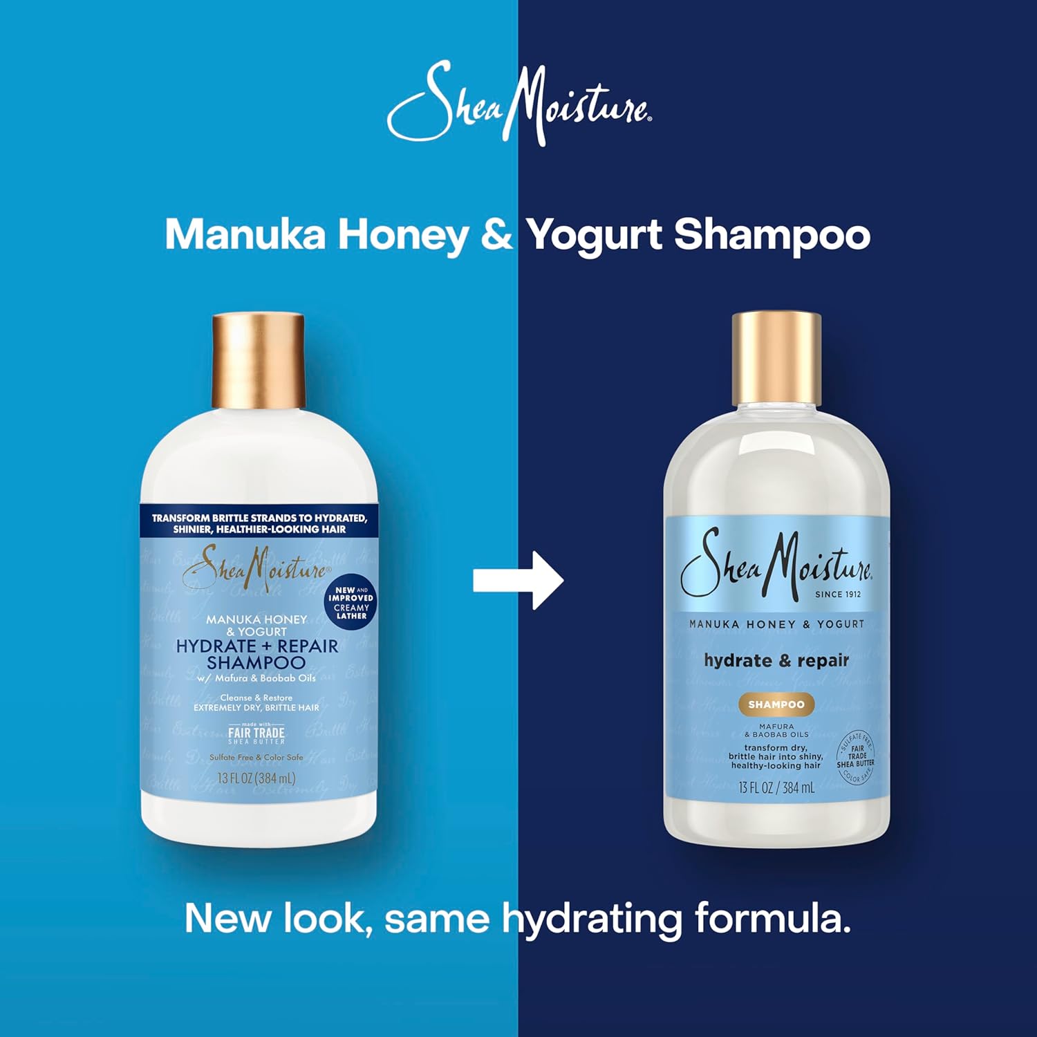 The SheaMoisture Manuka Honey & Yogurt Hydrate + Repair Shampoo, now with a NEW & IMPROVED formula, gently cleanses with a creamy lather.