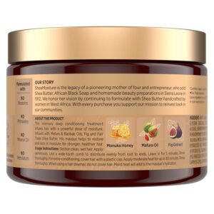 This intensive hydration hair masque infuses hair with a powerful dose of moisture and nutrients. This deep conditioning hair treatment masque is made with Shea Butter, and Mafura and Baobab Oils that are blended with antioxidant-rich African Rock Fig to restore and lock in moisture while deeply conditioning. Smoothes and fortifies follicles for stronger, healthier, frizz-free hair. This hair masque blends certified organic Shea Butter, Honey, and Mafura and Baobab Oils with antioxidant-rich African Rock Fig to restore and lock in moisture. As is the case with all SheaMoisture hair products, this intensive hydration hair masque is formulated with no sulfates, no parabens, no phthalates, no mineral oil, no animal testing, and no petrolatum. To use: Section clean, wet hair. Apply this deep conditioner generously. Use a wide tooth comb to distribute this hair product evenly from root to ends. Leave in for 5 minutes. Rinse thoroughly. For extra conditioning, cover hair with a plastic cap. Apply moderate heat for up to 30 minutes. When using a steamer, do not cover hair. Moist heat will add to the masque’s hydration. Our Story: SheaMoisture is the legacy of Sofi Tucker, a pioneering mother of four and entrepreneur, who sold Shea Butter, African Black Soap and homemade beauty preparations in Sierra Leone in 1912. We honor her vision by continuing to formulate with Raw Shea Butter handcrafted by women in Africa. With every purchase, you show support of our mission to reinvest back in our communities.