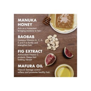 This deep conditioning hair treatment masque blends certified organic Shea Butter, Honey, Mafura and Baobab Oils with antioxidant-rich African Rock Fig to restore and lock in moisture