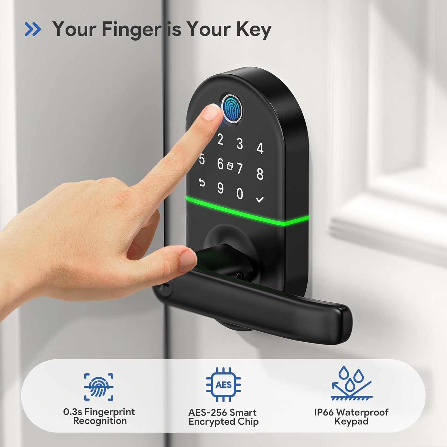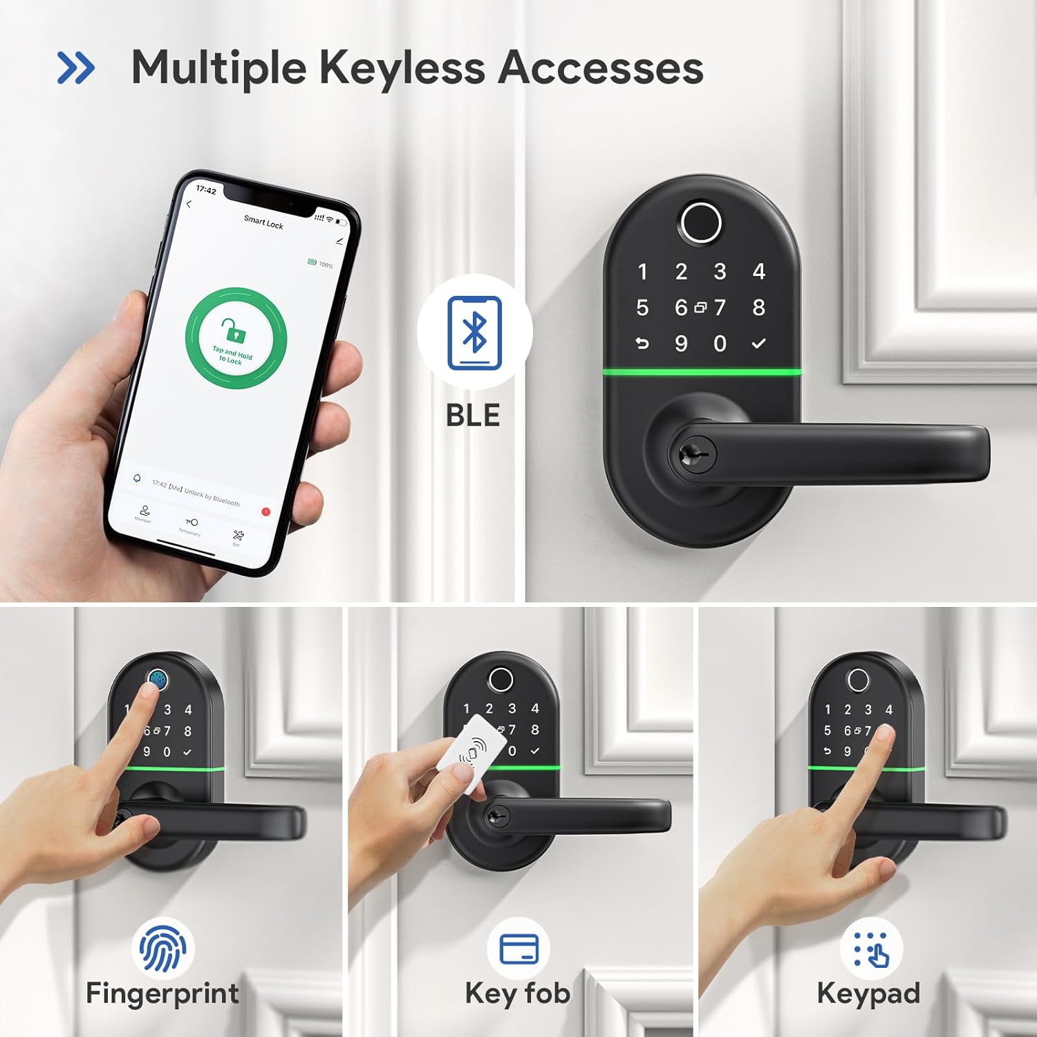 7 in 1 WiFi Keyless Door Lock with Handle: Upgrade your front door with 7 different unlocking ways – fingerprint recognition, Bluetooth app control, keypad password, key fob, physical key, remote unlocking, and Alexa voice commands. Offer personalized access for your children, elderly, and other family members, eliminating the worries of lost or stolen keys.