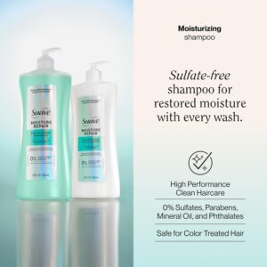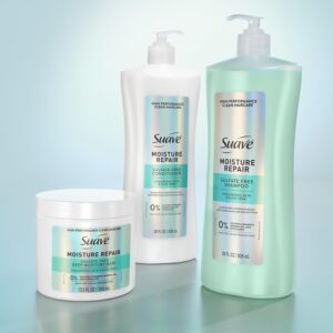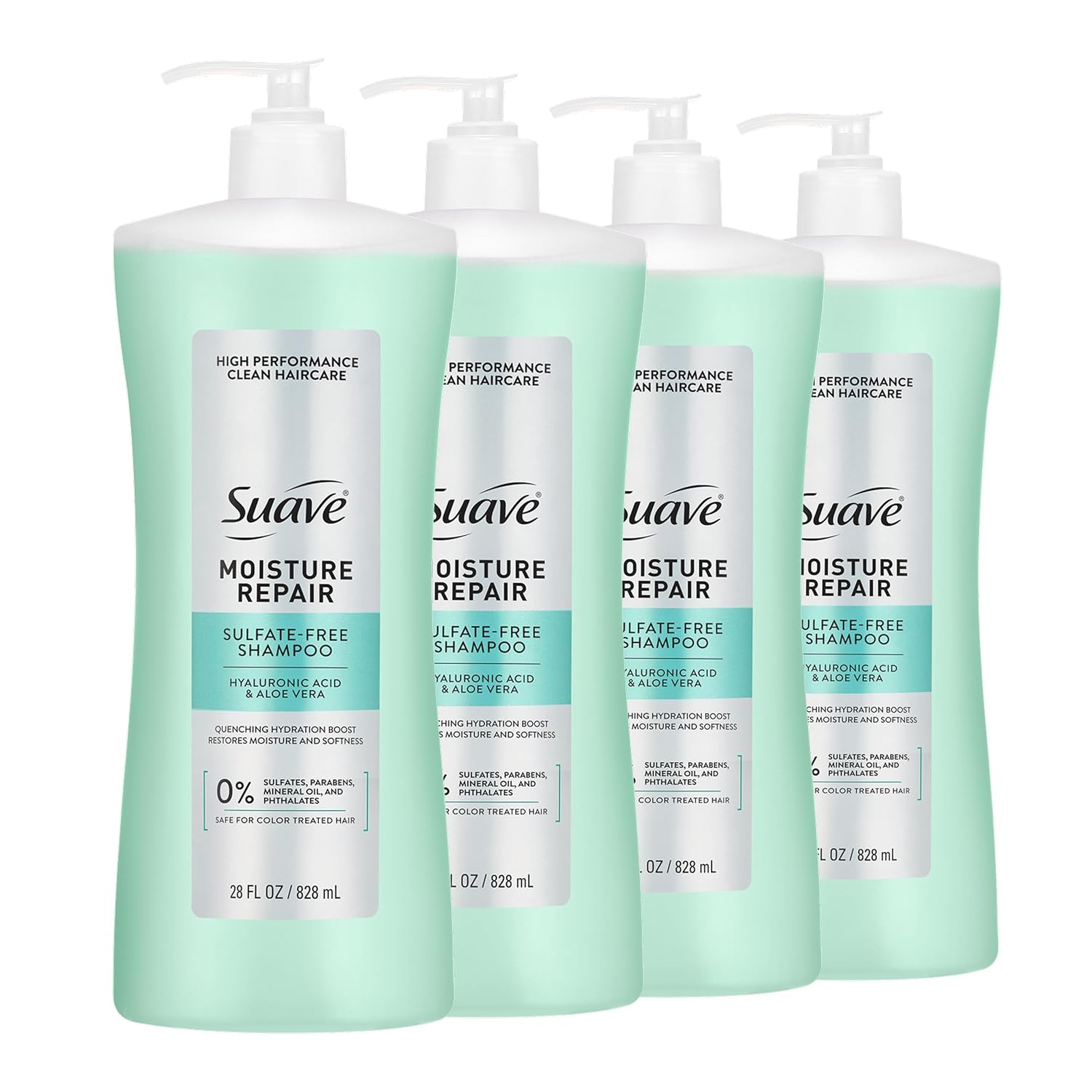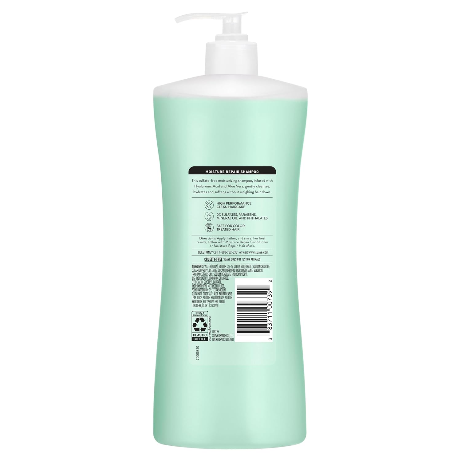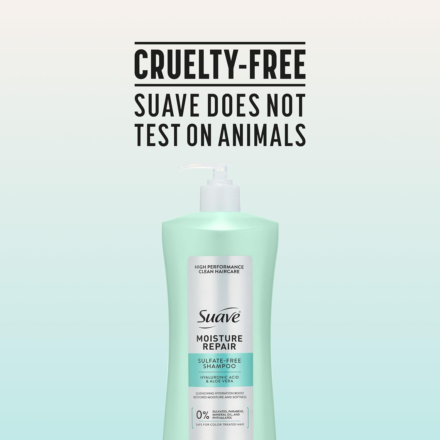 Revive dry, damaged hair with Suave Moisture Repair Sulfate-Free Shampoo, infused with hyaluronic acid and aloe vera to deliver deep hydration and restoring care. This gentle, sulfate-free formula cleanses without stripping, helping replenish moisture while improving softness, smoothness, and overall hair health. Hyaluronic acid helps attract and retain hydration inside the hair fiber, leaving strands feeling quenched and nourished. Aloe vera offers soothing, lightweight conditioning benefits that help soften texture and enhance shine. Together, they restore moisture balance to dry, dull, damaged, or frizzy hair, promoting healthier, more manageable results after every wash. Formulated without sulfates, parabens, mineral oil, or phthalates, this color-safe shampoo is gentle enough for daily use and ideal for dry, brittle, or color-treated hair. For over 75 years, Suave has offered professional quality haircare and skincare products for the entire family. Suave is committed to quality and accessibility, with a mission to make gold-standard products attainable for everyone, empowering people to look, smell, and feel their best every day.