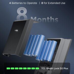 ๐จ๐ฝ ๐๐ผ ๐ด ๐ ๐ผ๐ป๐๐ต๐ ๐๐ฎ๐๐๐ฒ๐ฟ๐ ๐๐ถ๐ณ๐ฒ : The TCL smart deadbolt lock is powered by 8 AA batteries (not included) and lasts up to 8 months with typical use of 20โ30 unlocks per day. The lock beeps when battery power drops below 20% and sends low-battery alerts through the TCL Home App, reminding you to replace batteries in time and avoid power loss.
