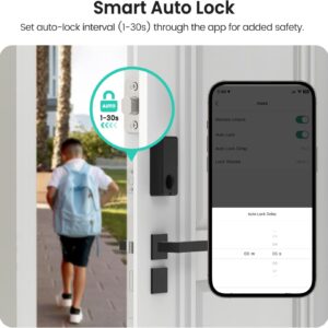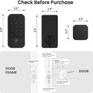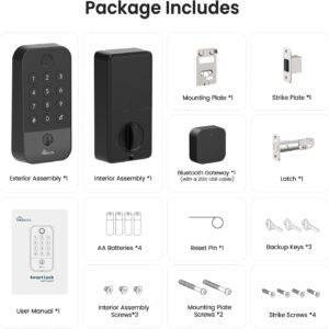 Effortless Installation in Minutes: Upgrade your door lock with just a screwdriver, no professional tools or expertise are required. The smart deadbolt lock is designed to fit door thicknesses of about 2-3/16″(54mm) and supports backsets of 2-3/8″ (60mm) or 2-1/8″ (70mm). Installation kit included: exterior/interior assemblies, latch, strike plate, mounting plate, Bluetooth gateway (with 20inch USB cable), 3 backup keys, 4 AA batteries, reset pin, user manual, and all necessary screws