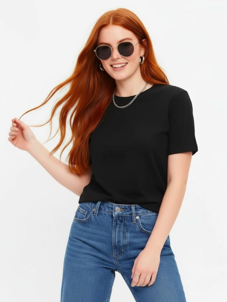 Experience the unmatched comfort and quality of our Women’s 100% Combed Cotton Black T-Shirt—a wardrobe essential designed for those who value softness, durability, and everyday versatility. Unlike ordinary cotton, we use combed cotton, which goes through an extra refining process to remove impurities and short fibers, resulting in a finer, stronger, and ultra-soft fabric. The tee is further enhanced with a bio-wash treatment and silicon softener finish, giving it a smooth, polished feel and superior resistance to pilling and shrinkage. This solid black t-shirt features a timeless crew neck design and short sleeves, making it suitable for every occasion—from daily wear to travel, workouts, and weekend outings. It’s pre-shrunk, so you don’t have to worry about losing your fit after washing. The tagless construction ensures maximum comfort, especially for those with sensitive skin. Whether worn on its own or layered under a jacket or hoodie, this classic fit tee delivers all-day breathability and effortless style. It’s the perfect go-to piece for women who appreciate premium basics with a modern edge.