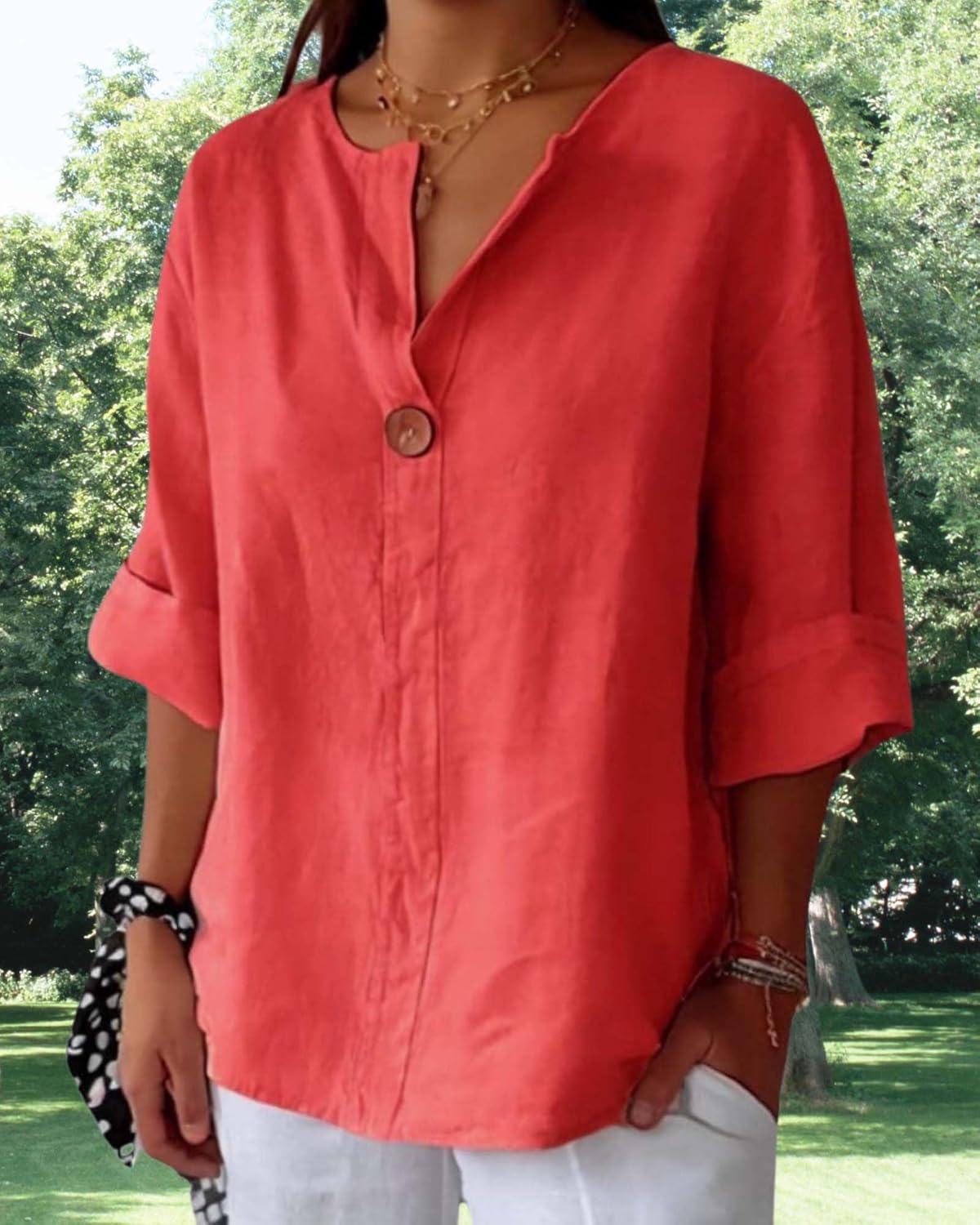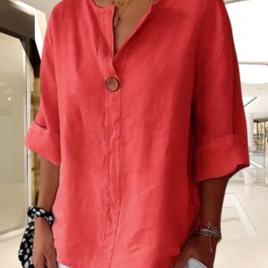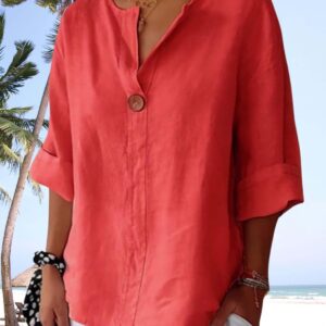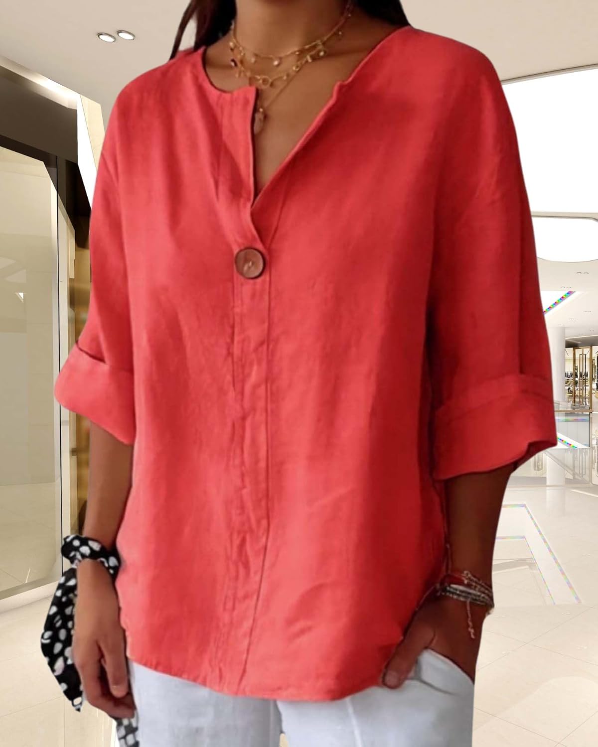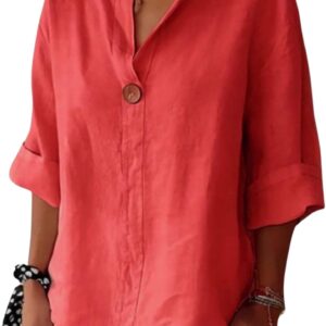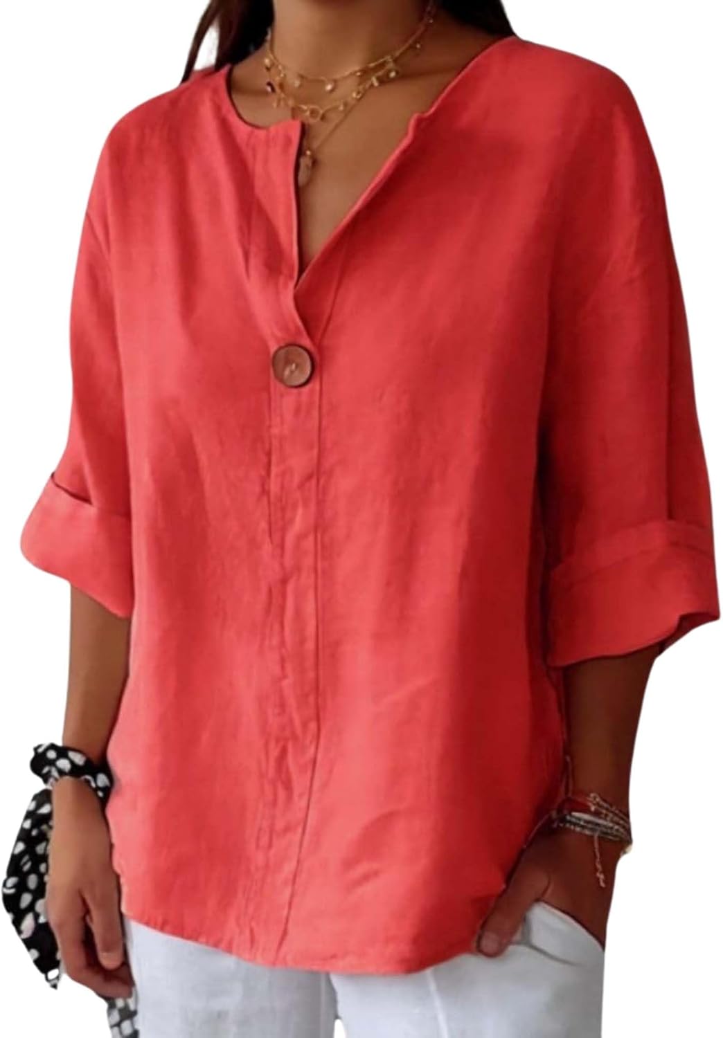 Womens Cotton Linen Button Down Shirts Casual Summer V Neck 3/4 Sleeve Solid Loose Fit Tunic Tops Vacation Tee