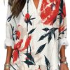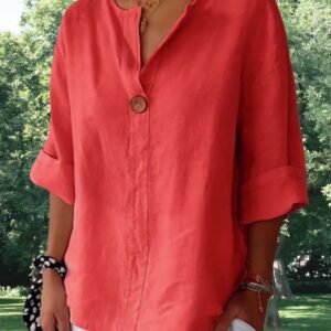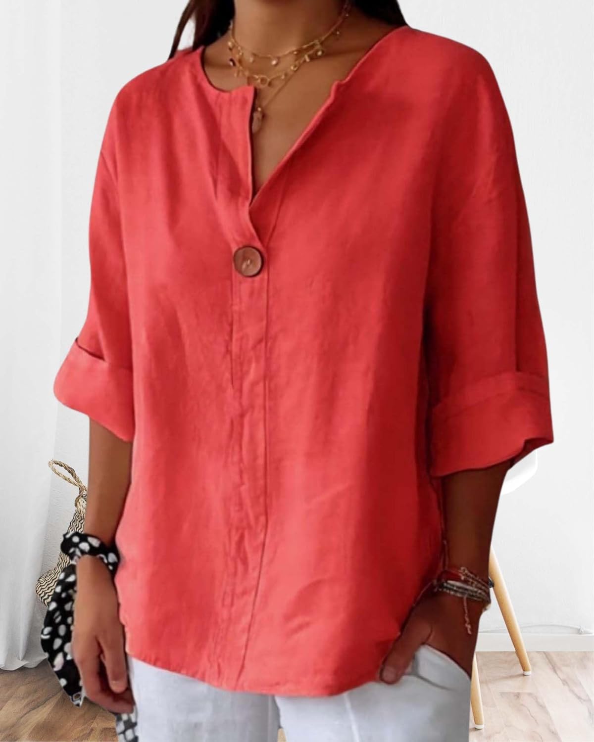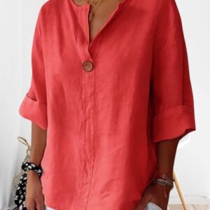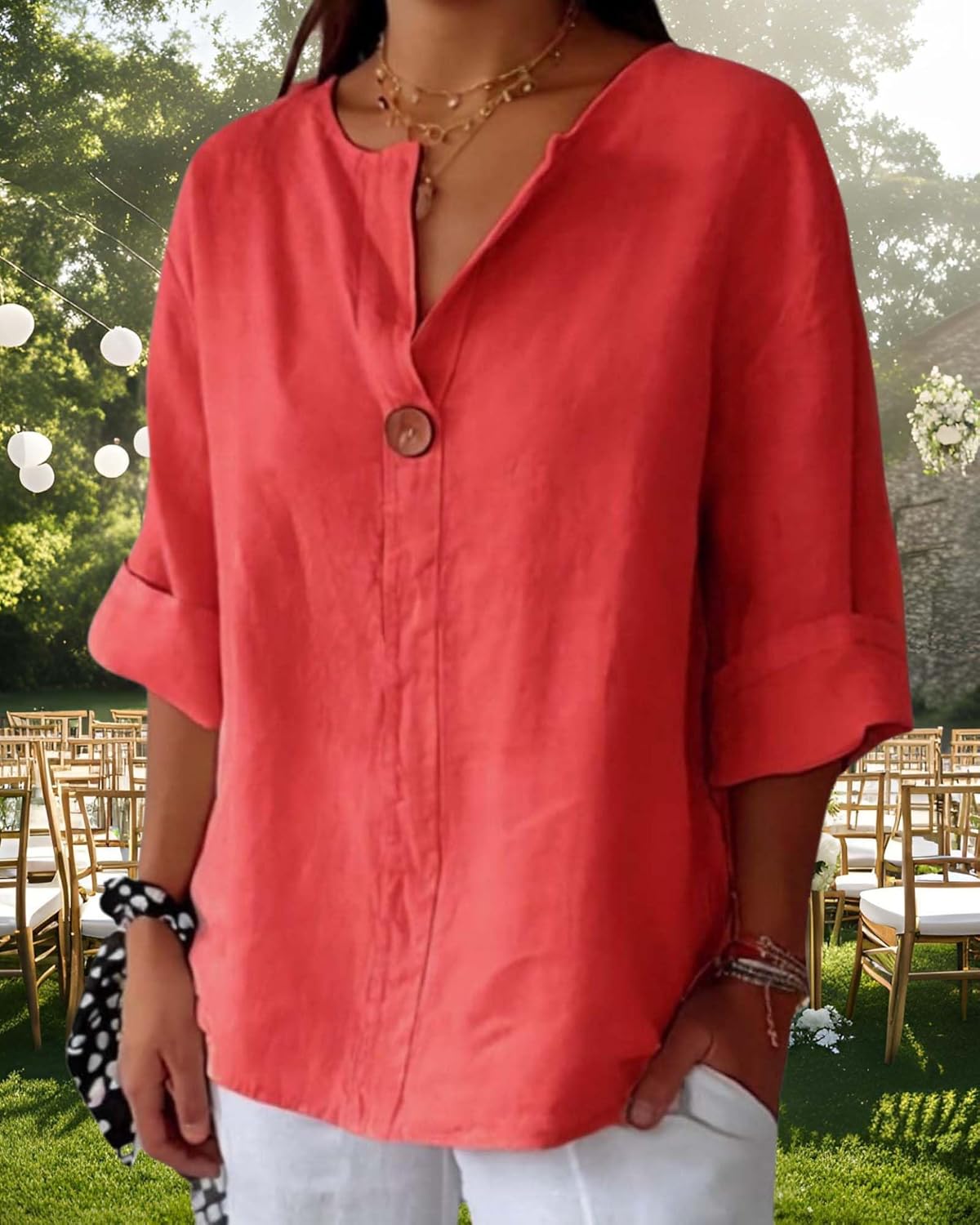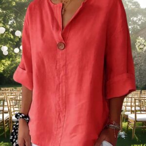 Womens Cotton Linen Button Down Shirts Casual Summer V Neck 3/4 Sleeve Solid Loose Fit Tunic Tops Vacation Tee